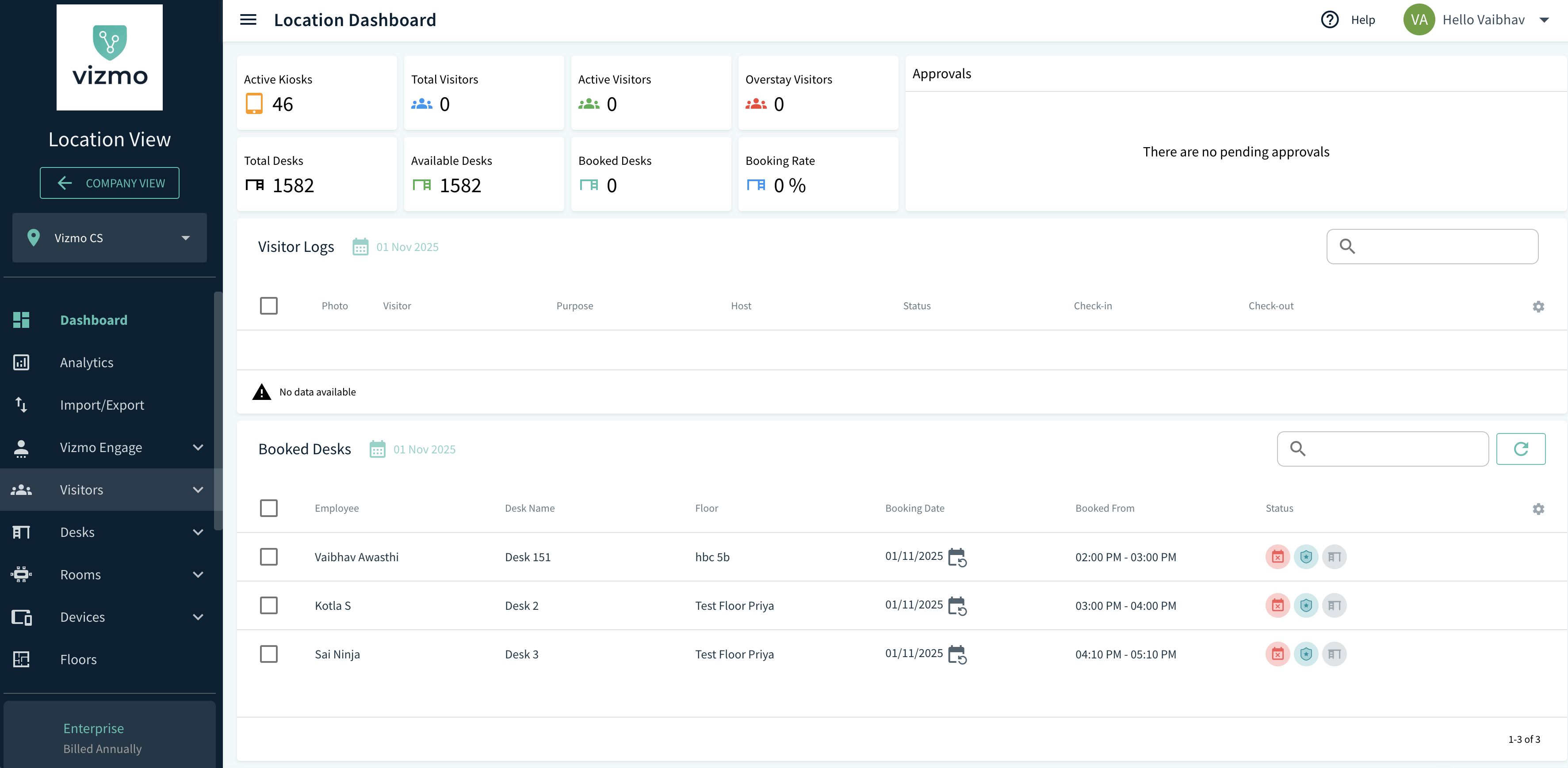 Admin Dashboard in Vizmo is a centralized view where both Location Admins and Company Admins (Super Admins)can monitor and manage various location's visitor management and desk booking and Room booking activities. The dashboard provides real time data